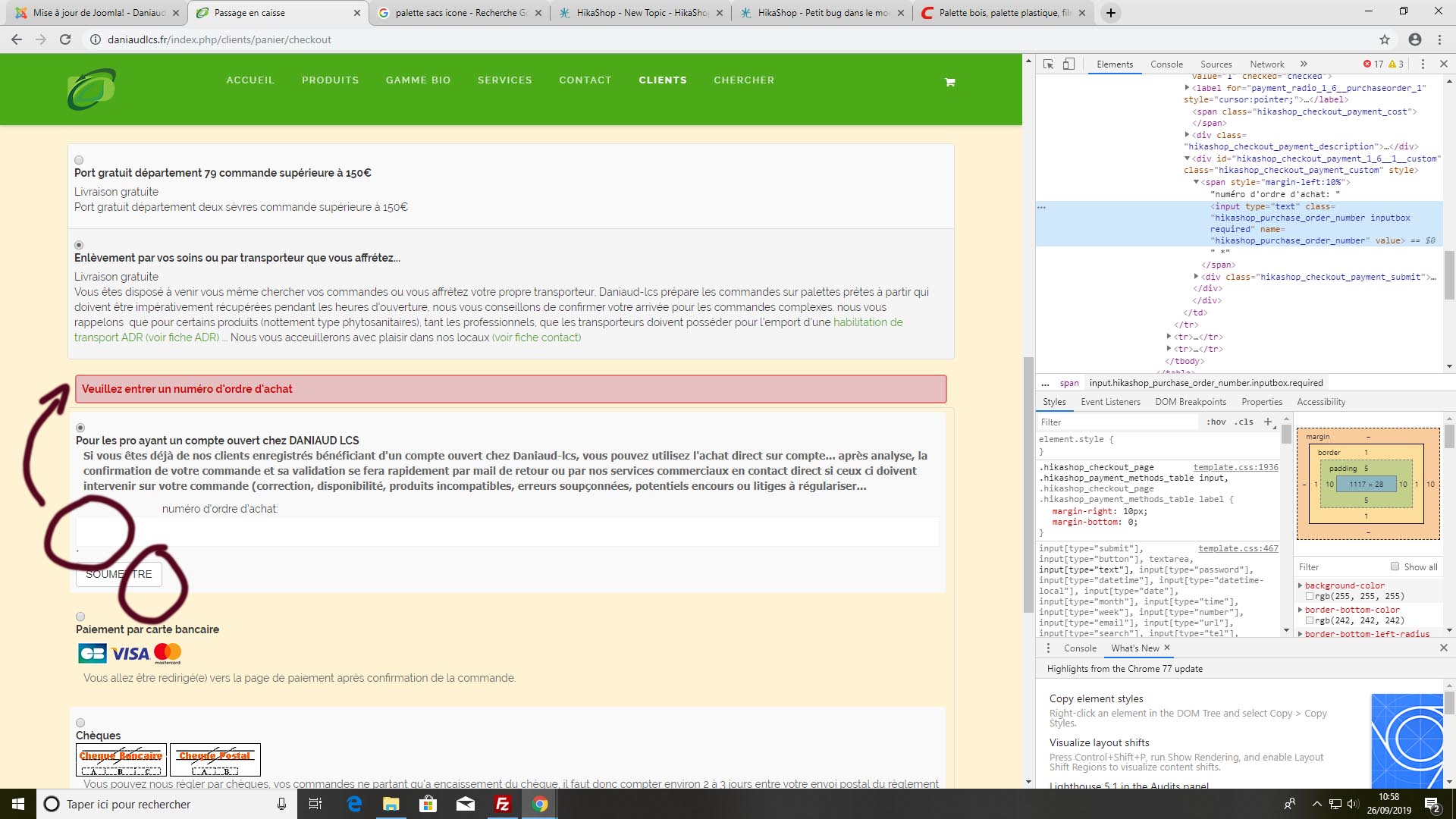 En plus du payement par CB opérationnel, j'utilise le plugin "HikaShop Purchase Order payment plugin" pour permettre à nos clients ayant des lignes de comptes ouverts chez nous de régler par ce biais, on valide alors commande manuellement "en attente" ... cela marche bien mais avec un inconvénient, il impose que le client notifie un numéro d'ordre d'achat (quelconque ???) et de devoir le valider or je ne comprend pas quel est l’intérêt de ce type de champs ordre d'achat que l'on peut remplir sans conditions restrictives ou vérifications, et même son utilité dans la mesure ou le client est déjà identifiable en clair à la commande ??? ... or un numéro croissant autogénéré ( sans validation a faire) ou juste un eurodadage en place suffirait en place ... l'idéal serait carrément d’annuler ce champs et l'autovalider ... je n'ai pas trouvé ou est est le fichier php (purxhase order) concerné et quelles lignes modifier... et comment faire sans trop tâtonner... auriez vous une suggestion