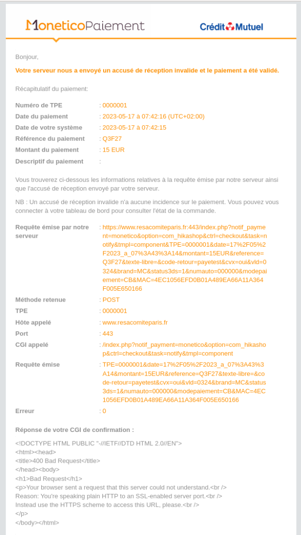 Lors d'un paiement, monetico reçoit une erreur 400 pour l'accusé de réception: