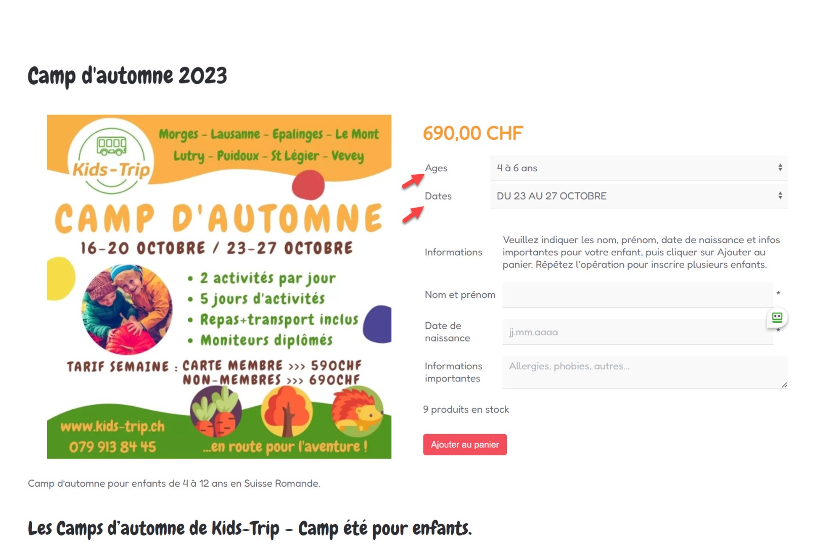 Je suis en train de configurer un shop pour des réservations de camps pour enfants.
