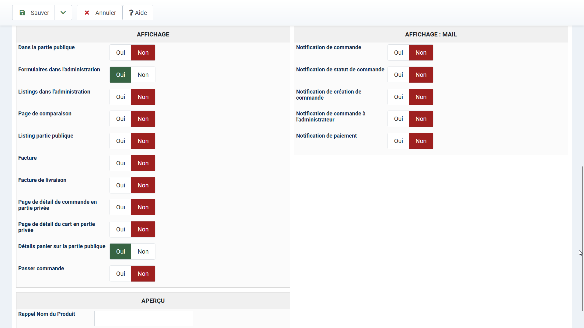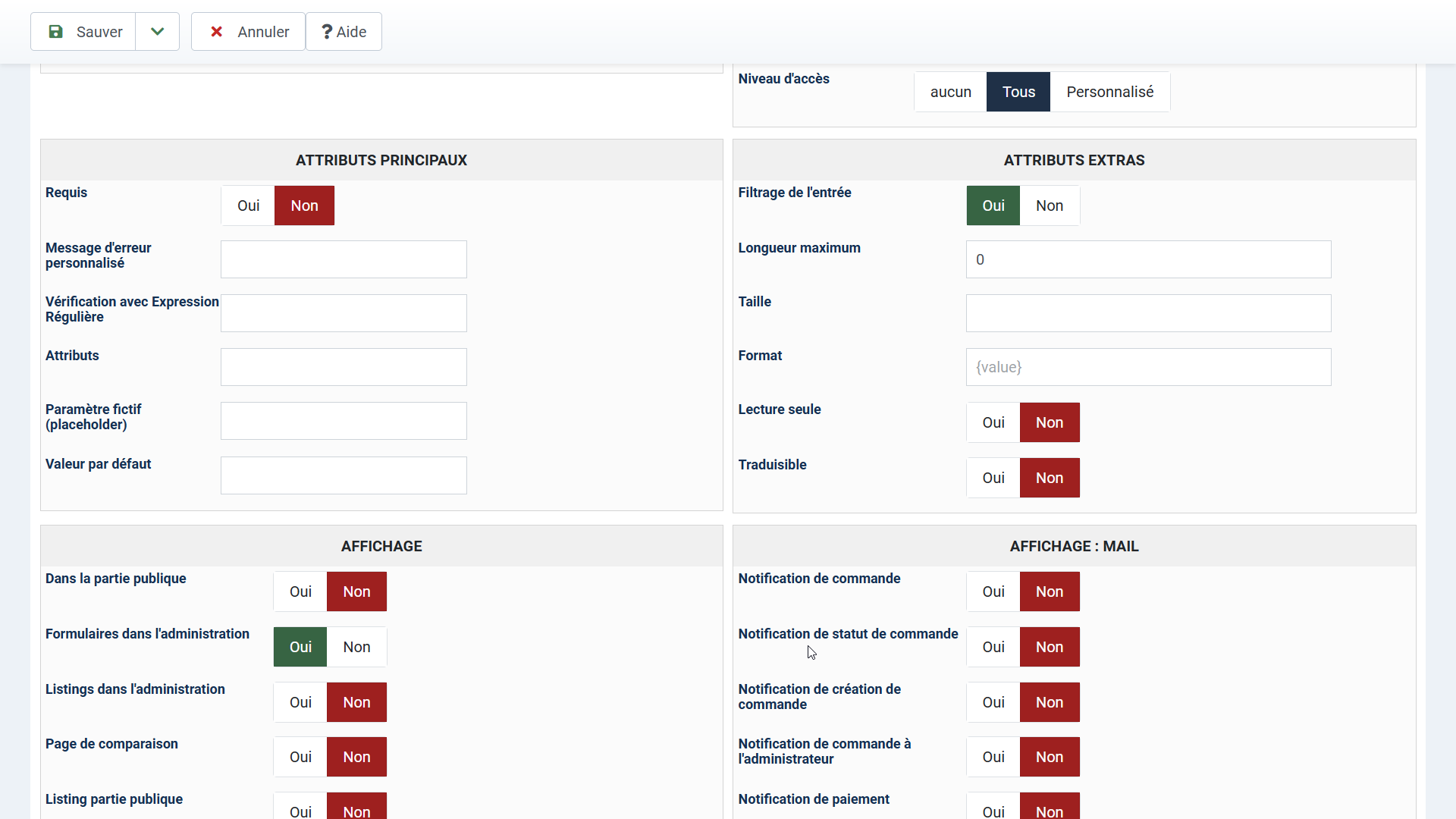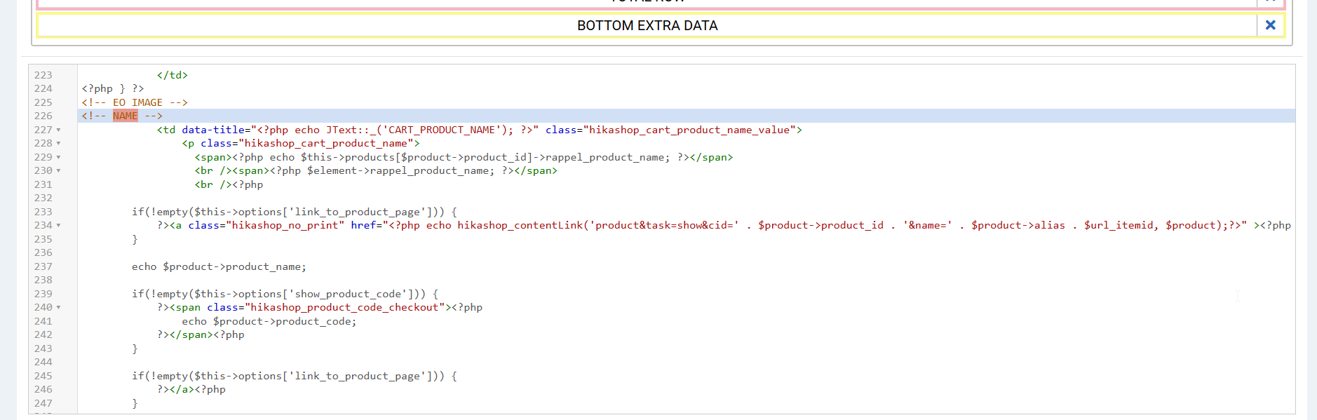 De plus, le code permettant l'affichage d'un champ personnalisé n'est pas nécessairement le même d'une vue à l'autre car différents nom de variables sont utilisées dans différents contextes pour les mêmes données (par exemple, sur la page de détail d'un produit, $this->element contient les données du produit en question, alors que sur un listing de produit, $this->element contient les données de la catégorie principale du listing, et les données des produits du listing sont dans $this->rows, avec $this->row contenant les données du produit en cours d'affichage).