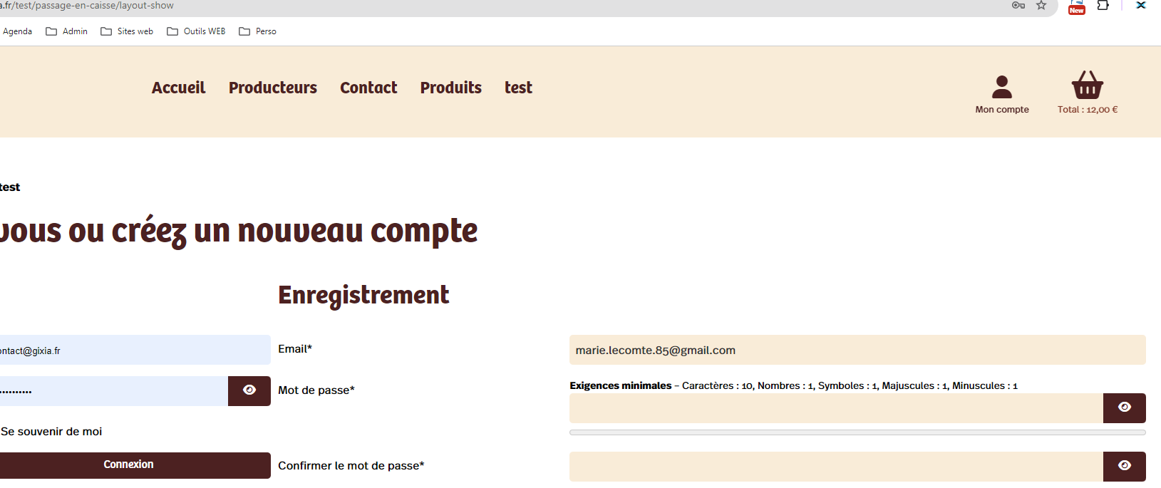 On voit ici que la première étape du panier s'affiche bien, mais avec le lien de menu test, ensuite l'alias seo du checkout, et le layout-show