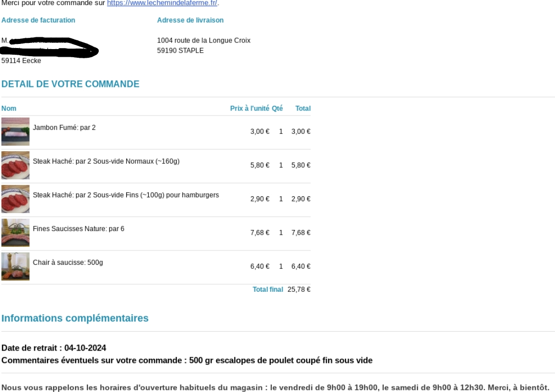 Nous vous rappelons les horaires d'ouverture habituels du magasin : le vendredi de 9h00 à 19h00, le samedi de 9h00 à 12h30. Merci, à bientôt.
