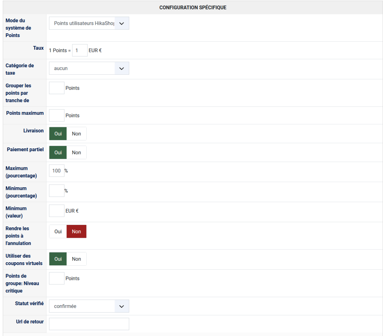 Je vous mets ci-dessous le paramétrage des différents statuts de commande et du plugin Hikashop de paiement avec des points :