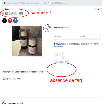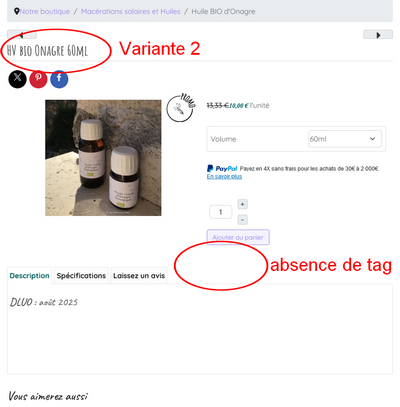 si justement, il y a un tag sur ce produit, et c'est lui qui ne s'affiche plus dès qu'on sélectionne une variante (j'ai parlé de champs perso mais je me suis trompé, car j'ai un champs perso aussi du même nom pour s'afficher en mode texte dans un des onglets, et lui s'affiche bien).