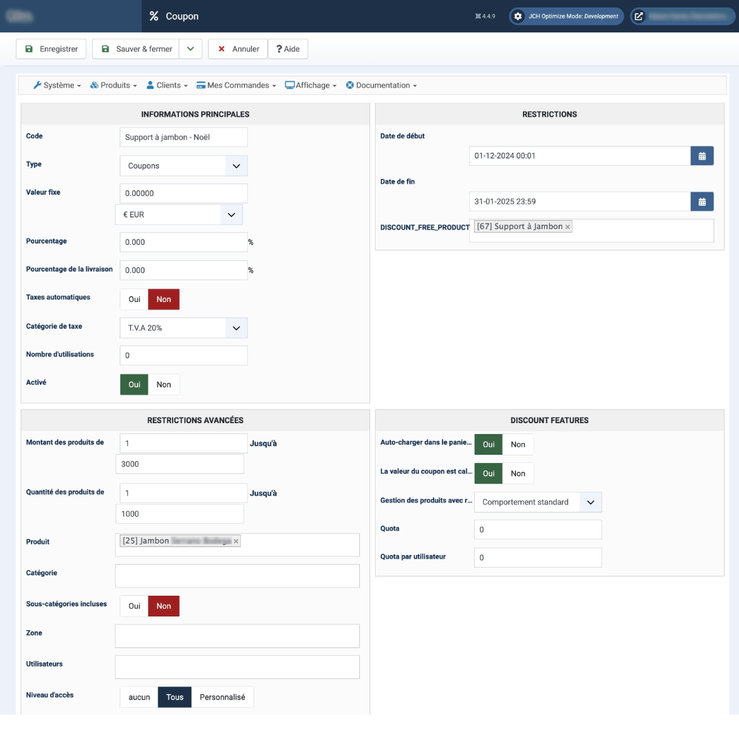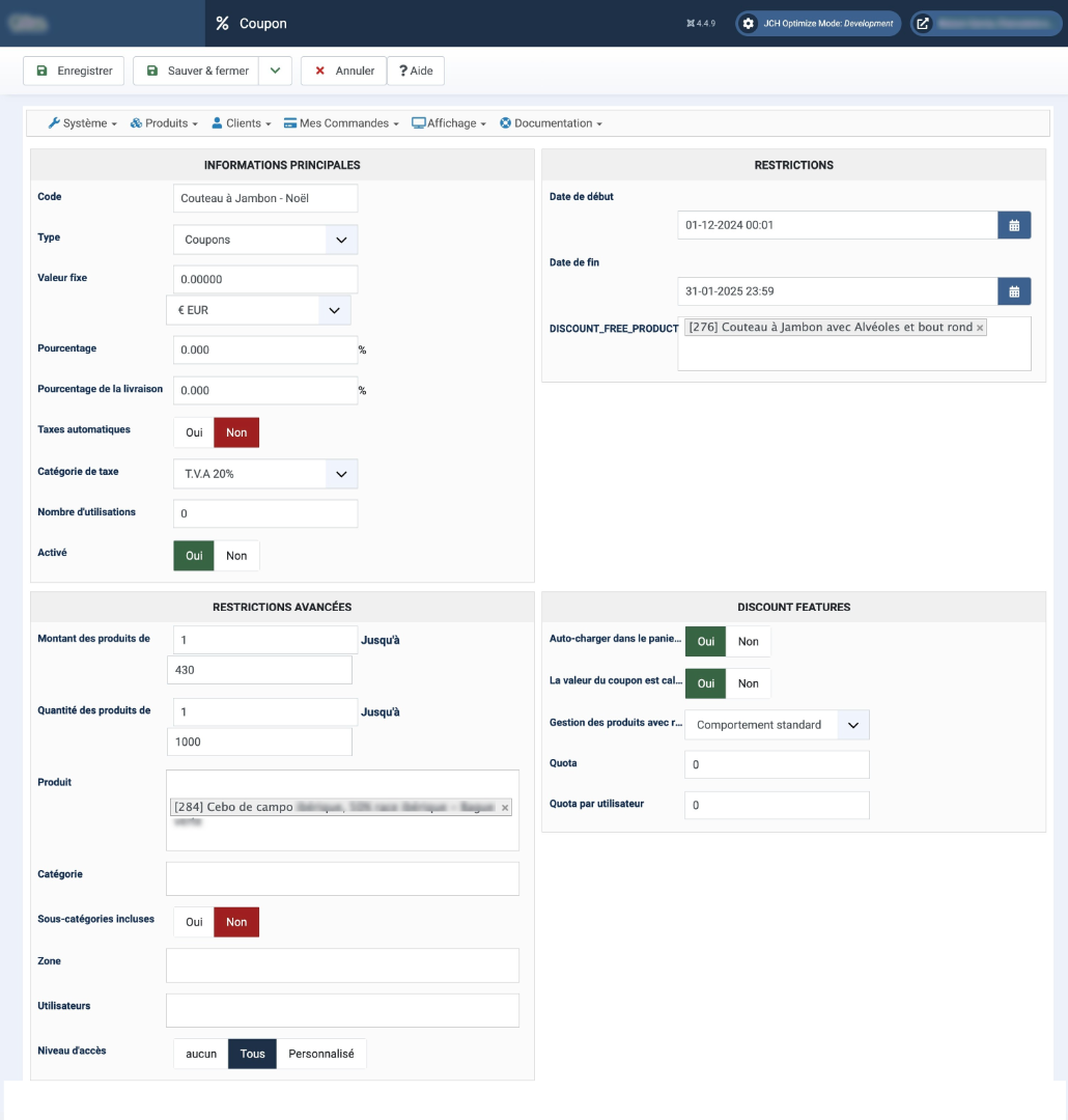 Cependant, le plugin coupon free product d'Obsidev ne gère pas les coupons lorsque le plugin multi coupon est utilisé. Ce serait quelque chose à rajouter dans le plugin coupon free product. Mais c'est à Obsidev de faire cela, car c'est leur plugin, et pas le notre. Donc il faudrait leur faire un retour en ce sens sur contact AT obsidev DOT com