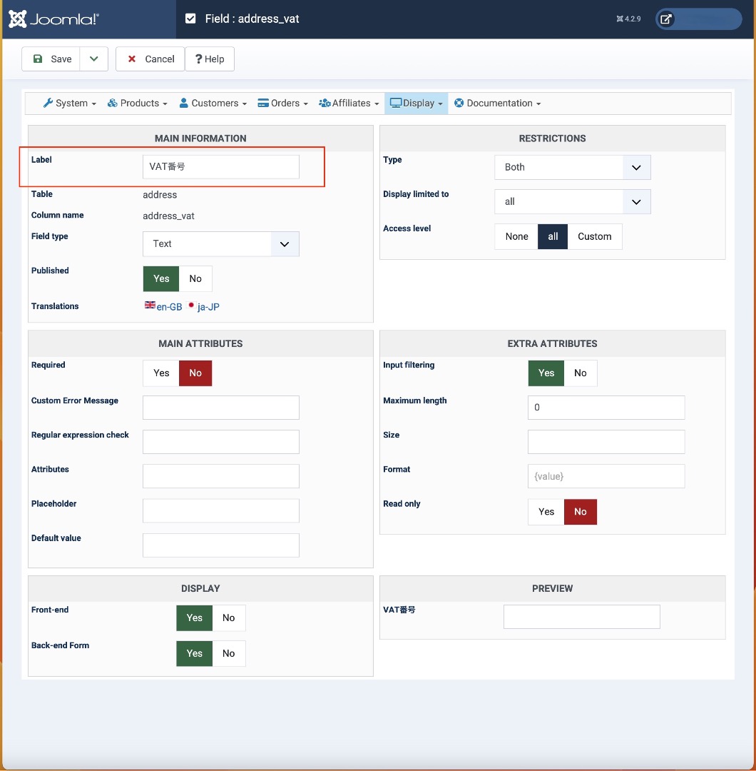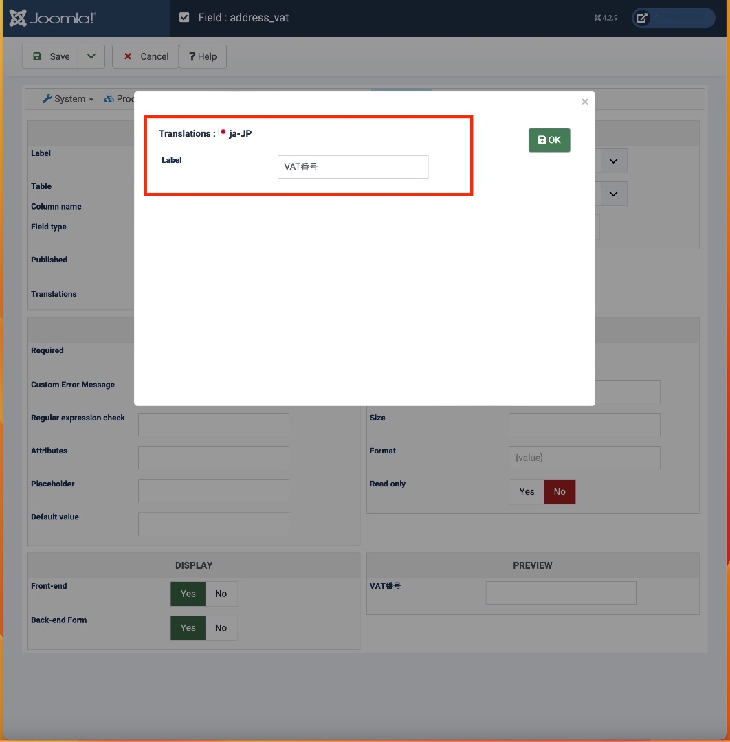 Then, in the label of the custom field address_VAT you should leave it to "VAT number" and then translate it in Japanese. It seems you've double translated the field label or something.