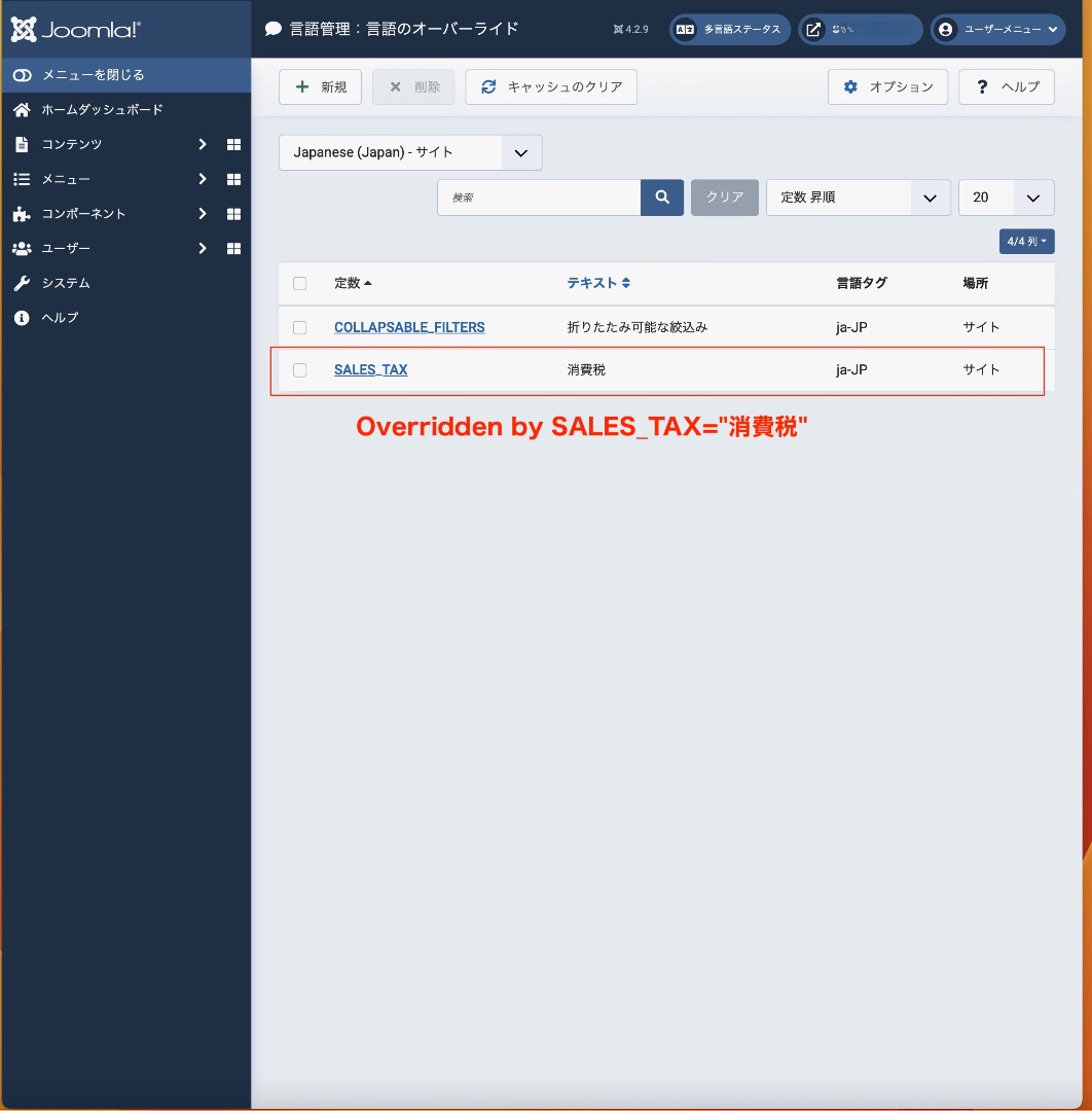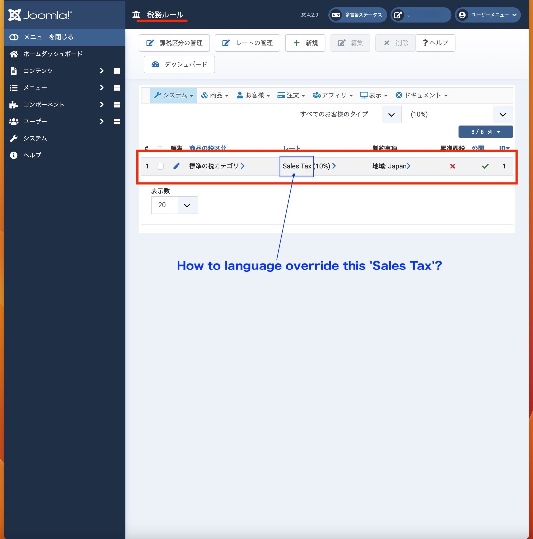 For example, if you use the text "Sales tax" in English for your tax rate, you can then add the translation override like: