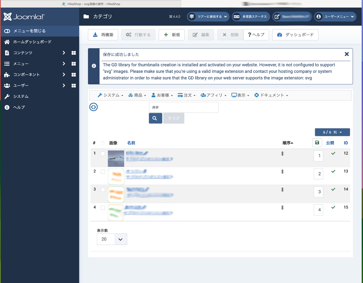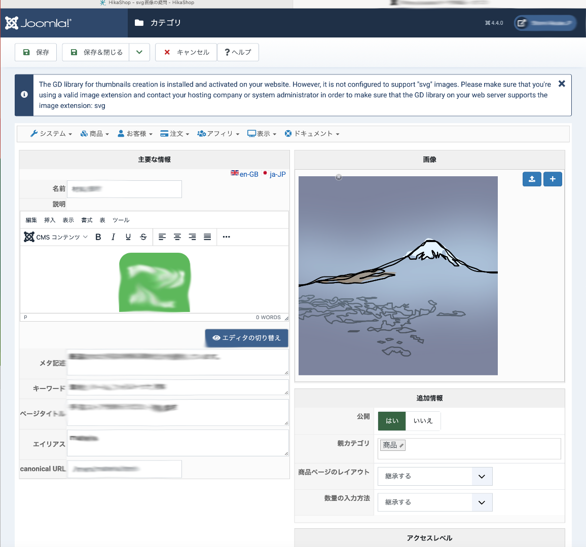 商品カテゴリにsvg画像を追加して保存すると、以下の表示文がでます。