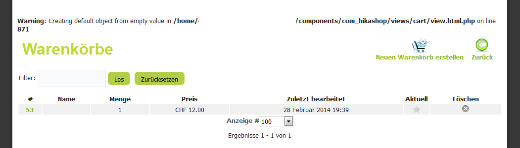 ich bekomme eine Warnung in der Benutzerverwaltung, wenn ich in den Warenkorb gehe.