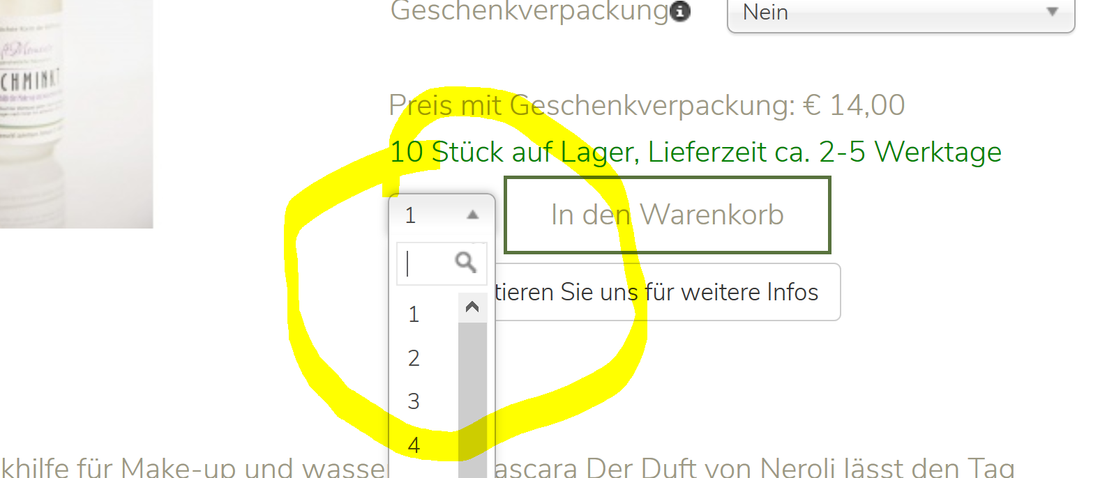 Link: OK -> www.duft-momente.at/new/shop/produkt/abgeschminkt The dropdown for the quantity is displayed.