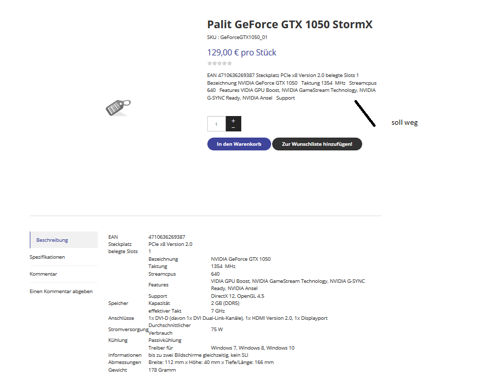 gebe, dann legt er oben unter dem Preis auch den Beschreibungstext an, nur leider eben nicht den ganzen, er schneidet das irgendwann sinnlos ab. Meine Frage ist nun, ich möchte dort oben einen andere Beschreibung haben, wie mache ich das. Ich habe ein Bild im Anhang, was dieses noch einmal verdeutlicht