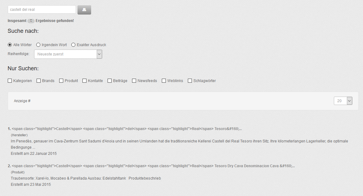 ich sobald ich suche, erhalte ich die meisten Ergebnisse falsch angezeigt, anstelle eines schönen Titels zum darauf klicken erhalte ich zB. dies hier: <span class="highlight">Castell</span> <span class="highlight">del</span> <span class="highlight">Real</span> Tesoro ...