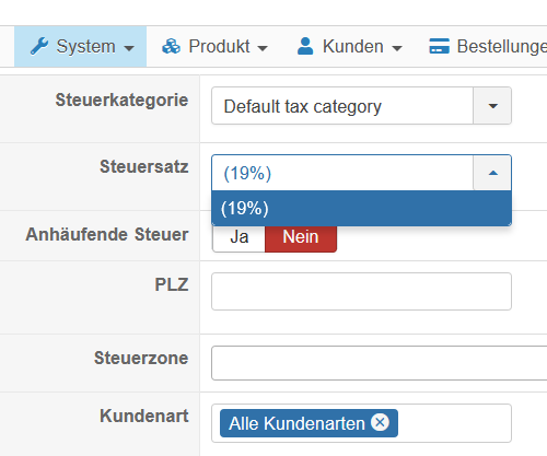 Im Bereich Steuern, Steuerzonen, Währung gibt es immer nur 19% als Auswahl...evtl. hat jemand einen Tipp.