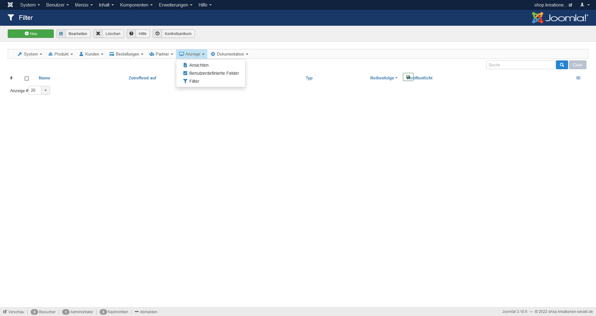 Im Backend der noch nicht aktualisierten Seite wird im Hikashop-Menü unter Anzeige der Menüpunkt "Filter" angezeigt.