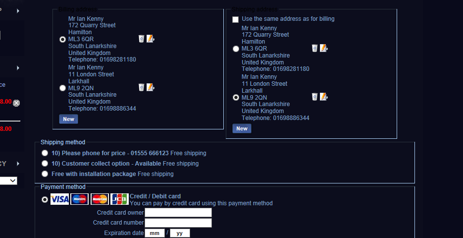 You will notice that there are two possible billing addresses, and two possible shipping addresses. They are very close together, one above the other. What I would like to do is introduce a space between them, and I suspect the best way to do this is to add padding after the telephone number, which is what I was trying to do.
