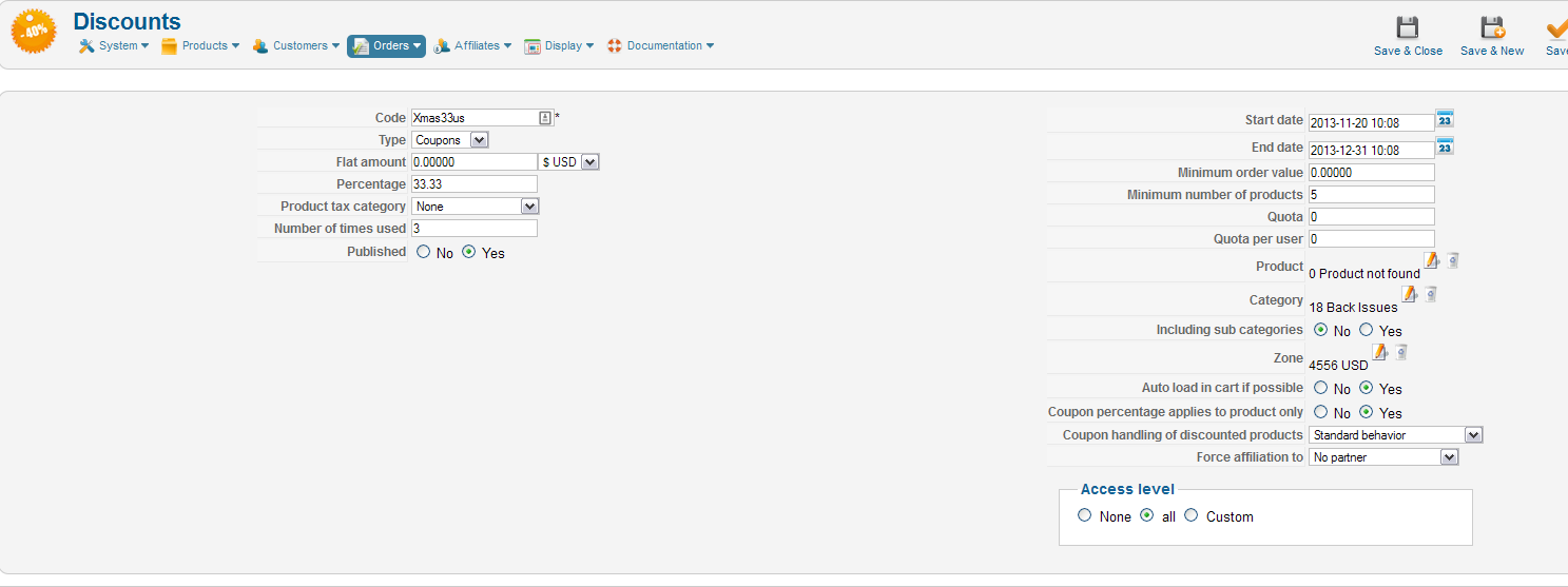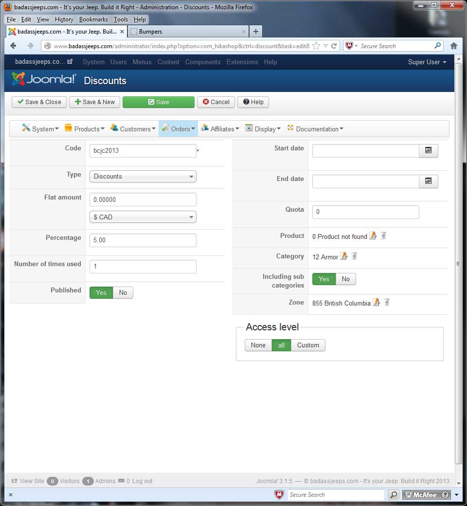 I've set a discount called "bcjc2013" to apply a 5% discount to products in the Armor category. See the attached screenshot for details.