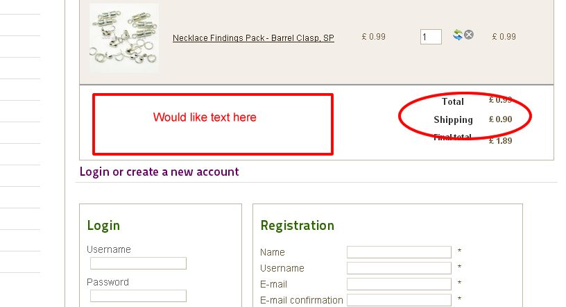 When users go to their cart, a shipping cost (based on shipping within the UK) shows. This is fine, but some of my overseas shoppers are a little confused, so I would like to be able to add a note at the side, telling them to log in or register for shipping to their address.