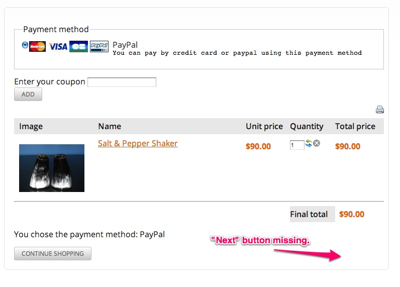 I would say that it's probably because you have the "shipping" view in your checkout workflow but that you didn't configure shipping methods (or you did, but not correctly) and thus the system doesn't allow you to continue and display an error message.