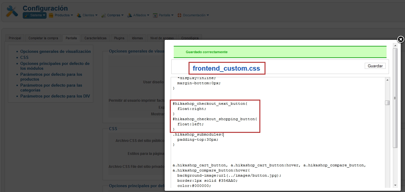 Hello again, I want to change the color and position of the buttons on the checkout. In HikaShop> Settings> System> Screen> CSS> CSS File Public Site> Custom, I have seen the CSS code of the two buttons (image1).
