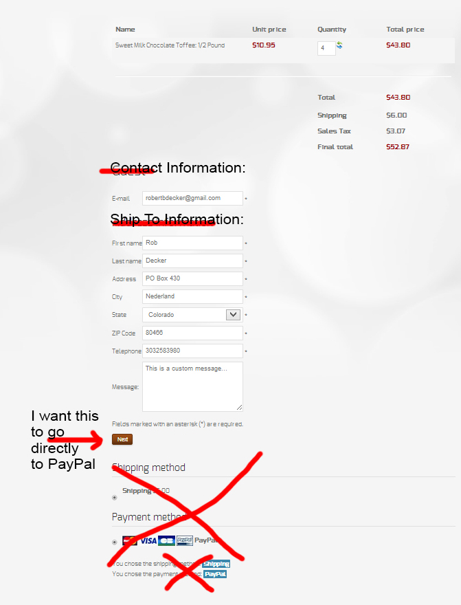 Essentially, I want the user to be able to add items to their cart as usual. When they check out, I just want them to see the cart, add an e-mail address for the purchaser, the shipping info, and then go straight to PayPal. I do not want to go to the interim page that shows the cart again, shows Billing and Shipping info (and options to add or change), and has other shipping and purchase info at the bottom. I simply want the user to fill out the purchase and ship to information, and then go straight to PayPal for the transaction. I do not want to collect or store anyone's billing information. When they click Next or Finish, they go straight to PayPal to complete the purchase.