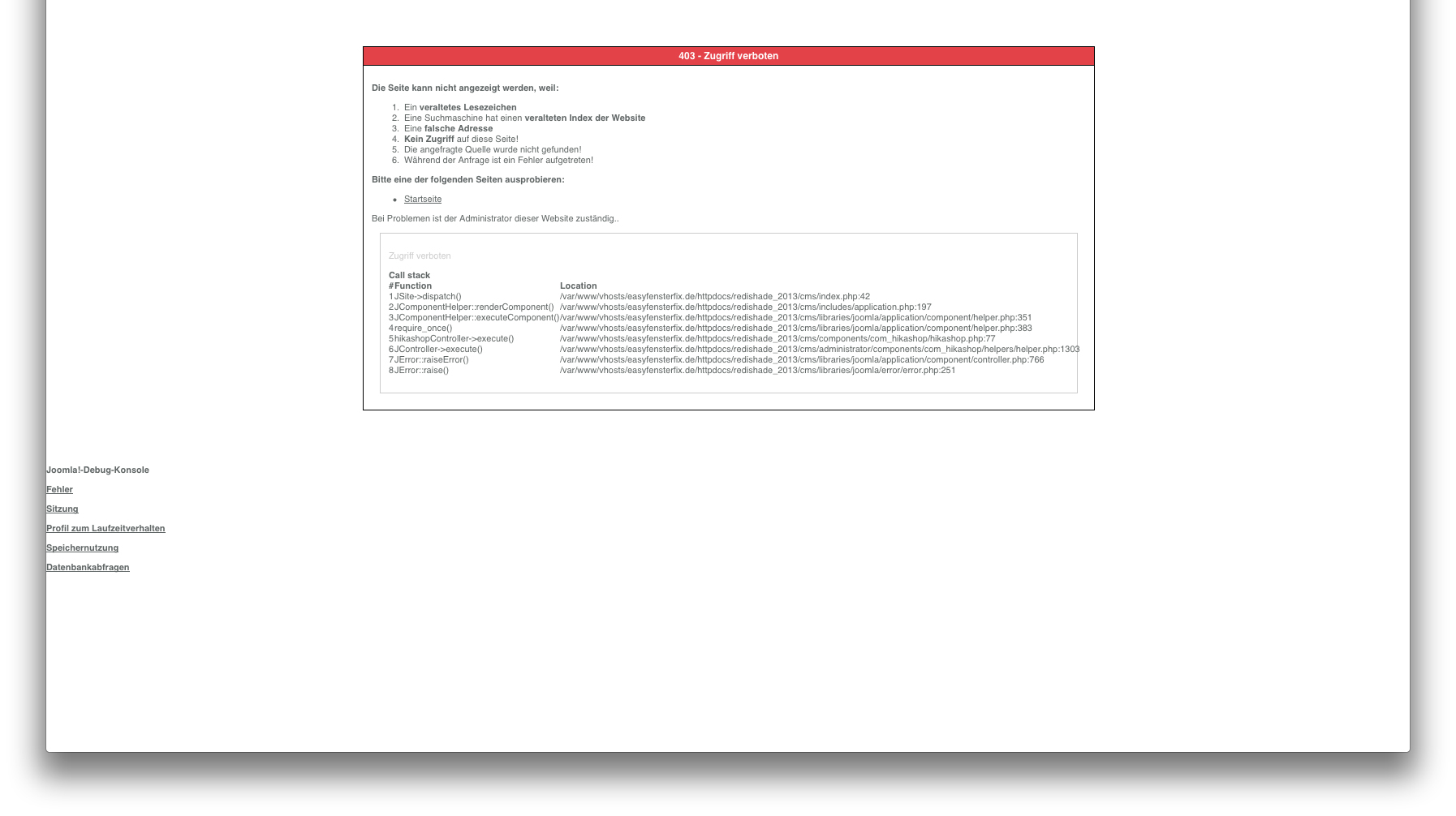 8 JError::raise() /var/www/vhosts/easyfensterfix.de/httpdocs/redishade_2013/cms/libraries/joomla/error/error.php:251