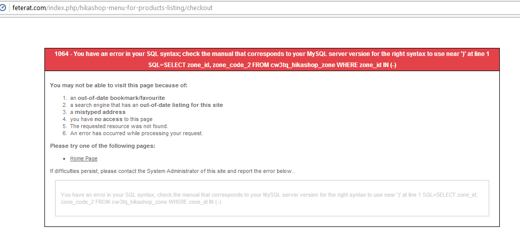 1064 - You have an error in your SQL syntax; check the manual that corresponds to your MySQL server version for the right syntax to use near ')' at line 1 SQL=SELECT zone_id, zone_code_2 FROM cw3tq_hikashop_zone WHERE zone_id IN (-)