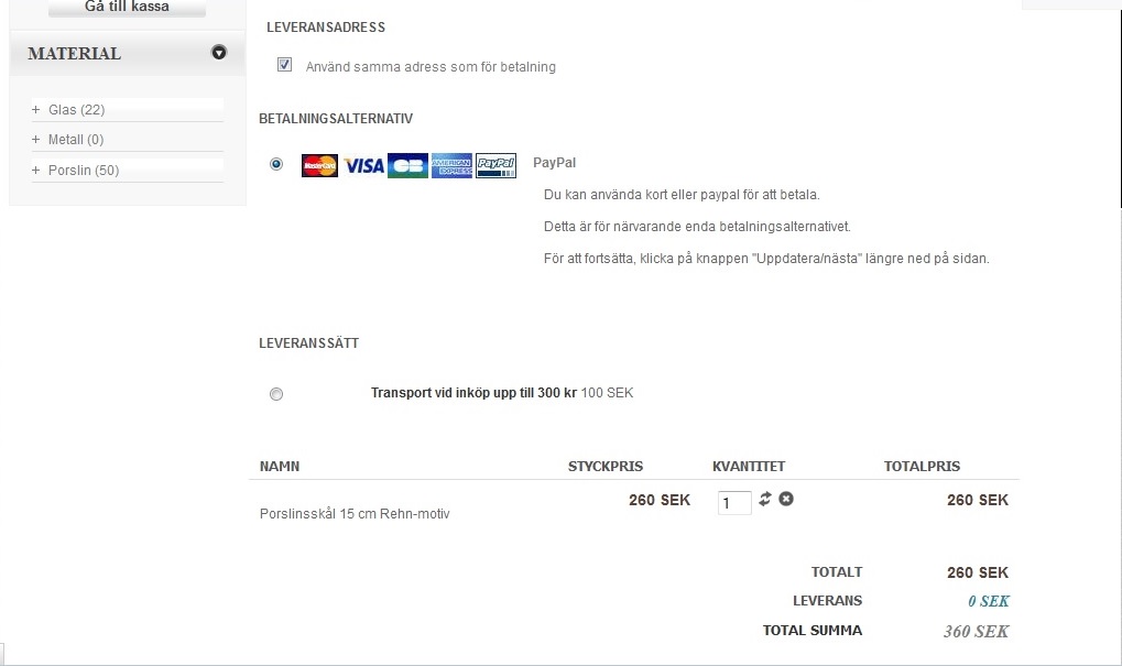 If I press the continue/update button at the very bottom of the page, I am forwarded to the paypal payment, and the sum drawn is 360 SEK (i.e. shipping is included for the cost of 100 SEK).