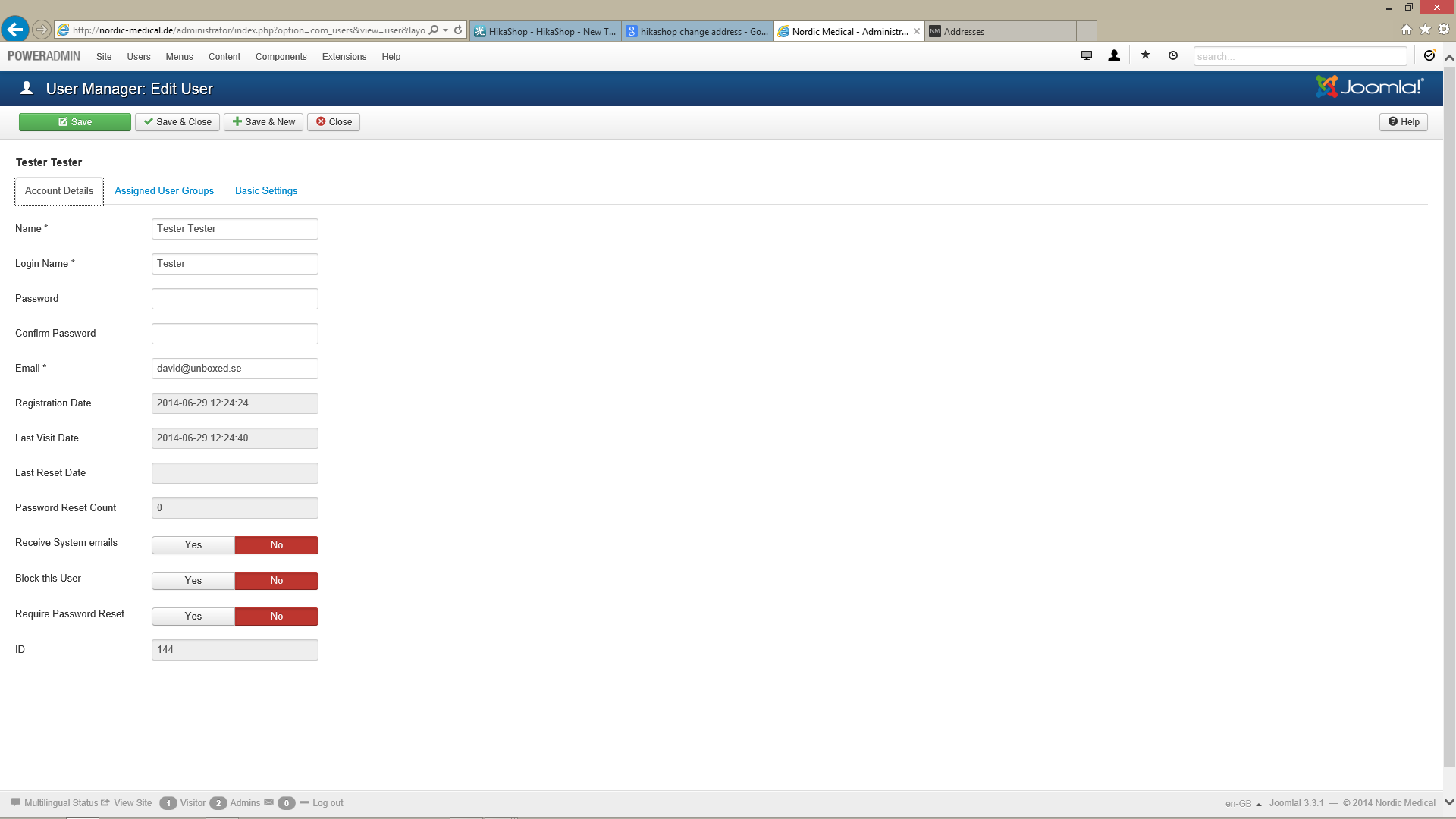 The user is properly added as a Joomla user