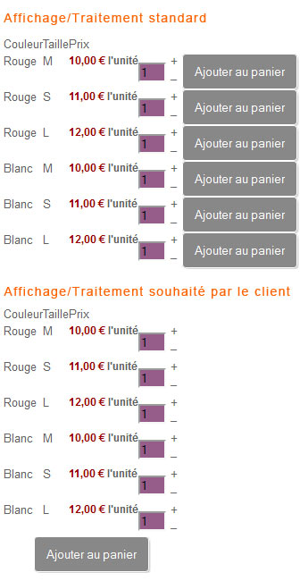 Compte-tenu du nombre de variantes pour chaque produit (4 Tailles x 10 couleurs) son souhait est de pouvoir, en une seule transaction et non pas ligne par ligne, ajouter au panier la saisie des quantités de chaque variante.