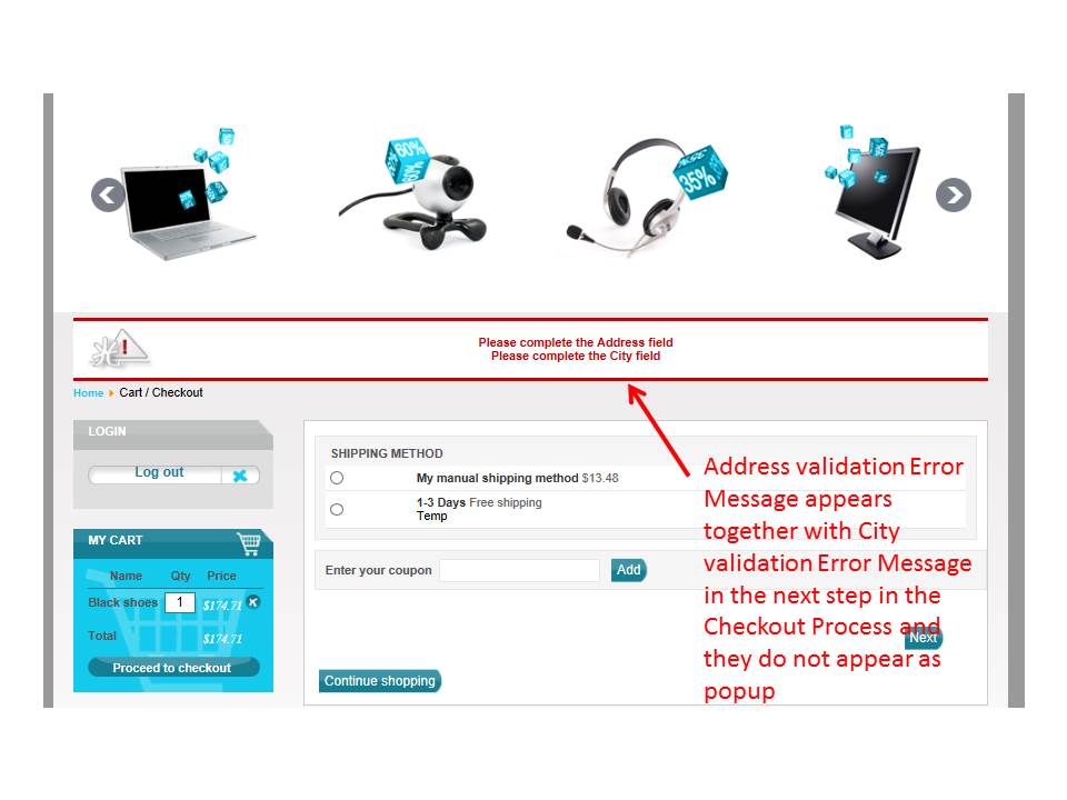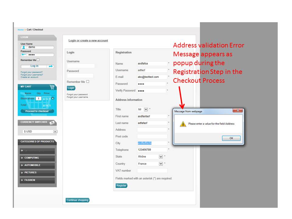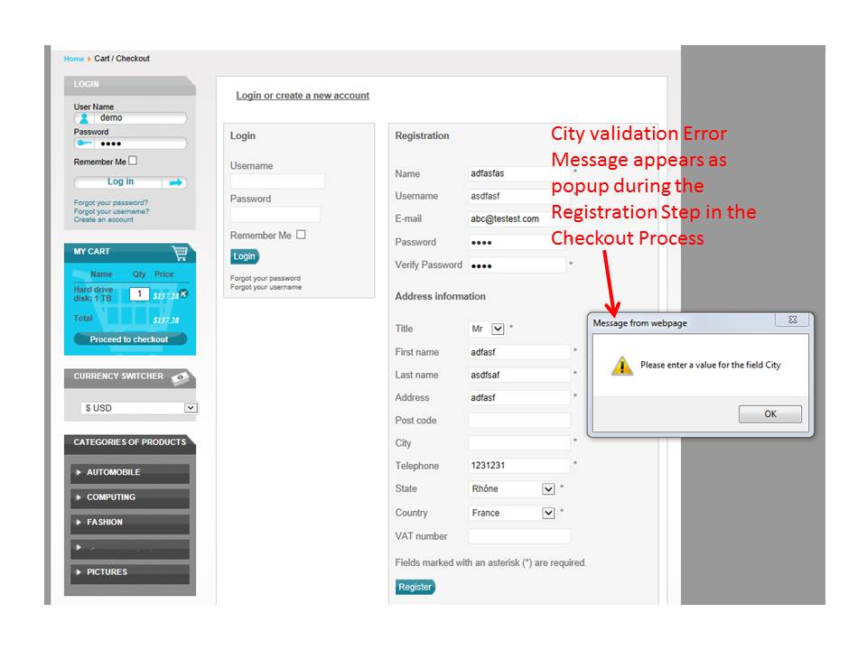 The field validation behaviour and error message display are inconsistent during the checkout process. Sometimes the error is displayed as a popup and the user cannot proceed until the error is corrected (i.e. one error at a time) whilst at other times, the errors are lumped together (and the user is allowed to continue to the next field and/or step) and then, all the errors are displayed together at the Joomla! message area.