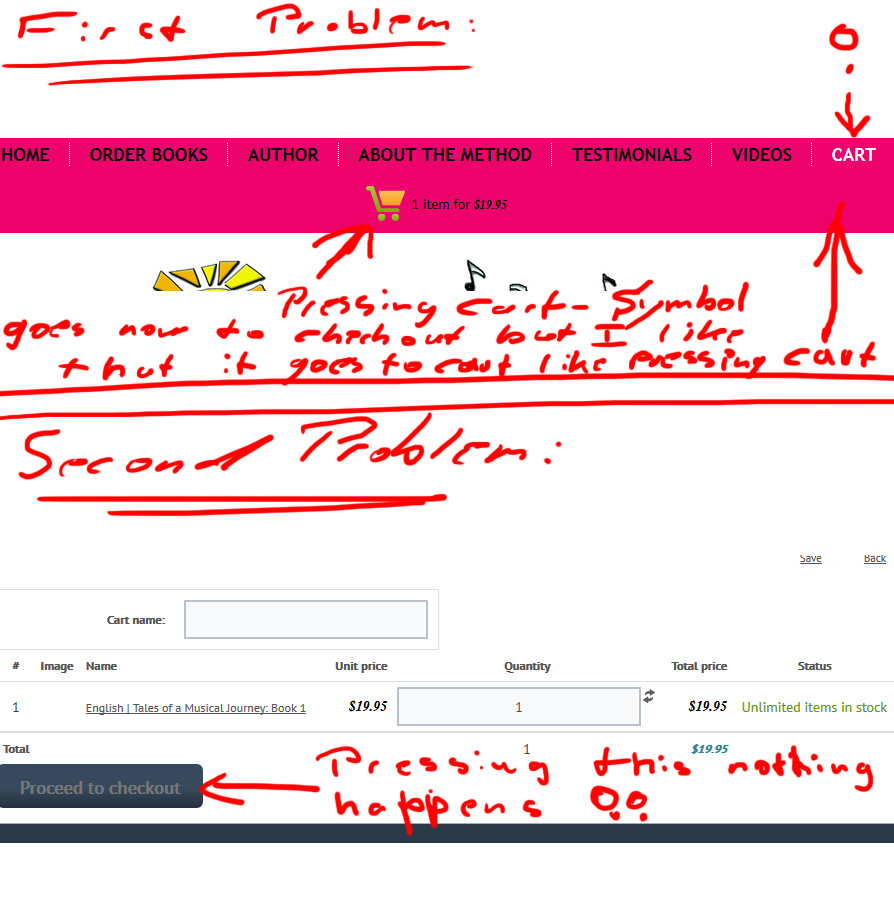 - When you still have something in the cart you also have a GREEN / YELLOW CART SYMBOL in the top of the page (header of the page) under the Top Menu. When you press this cart-symbol it goes directly to the checkout - but that makes not really sense because my opinion is that it has to go to the cart. Now it goes to www.gorinpianotales.org/checkout/checkout . But it would be more logical it would go to www.gorinpianotales.org/checkout because this show the cart and you have the optional button to PROCEED TO CHECKOUT (that actual wont work - see FIRST PROBLEM). Behind the cart-symbol simply works the cart-module of Hikah-Shop.