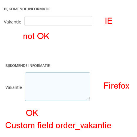 Please select a product and put it in your basket, then try to buy it, in step 1 where one can login or register their you can see (or not in IE) the fields Vakantieperiode (Holiday) and Opmerkingen (remarks).