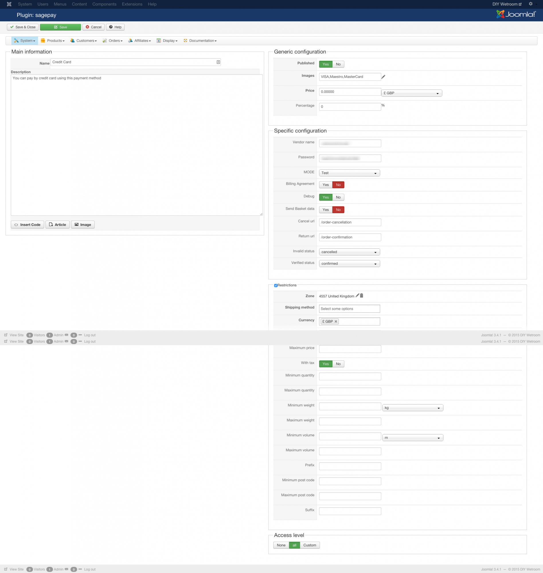 3. I'm using SagePay as my gateway and running it in Test mode. When I click Finish a page of script flashes before going to a sagepay error screen which shows Error 3045 : The Currency field is missing.