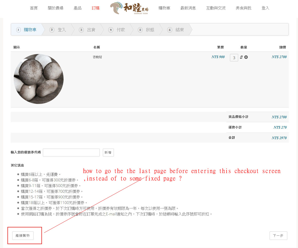 1. The modification will make the button return to the previous page. That's all. Not return to the last listing page. To have it return to the last page before the checkout change that code to: