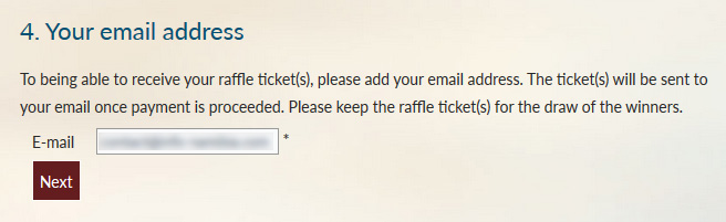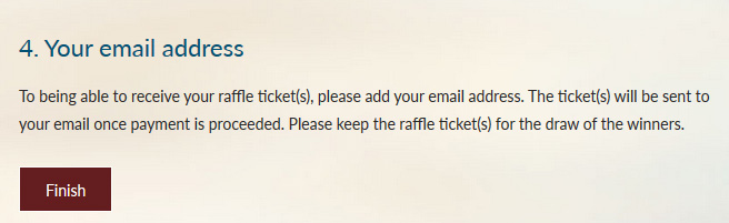 echo "To being able to receive your raffle ticket(s), please add your email address. The ticket(s) will be sent to your email once payment is proceeded. Please keep the raffle ticket(s) for the draw of the winners. ";