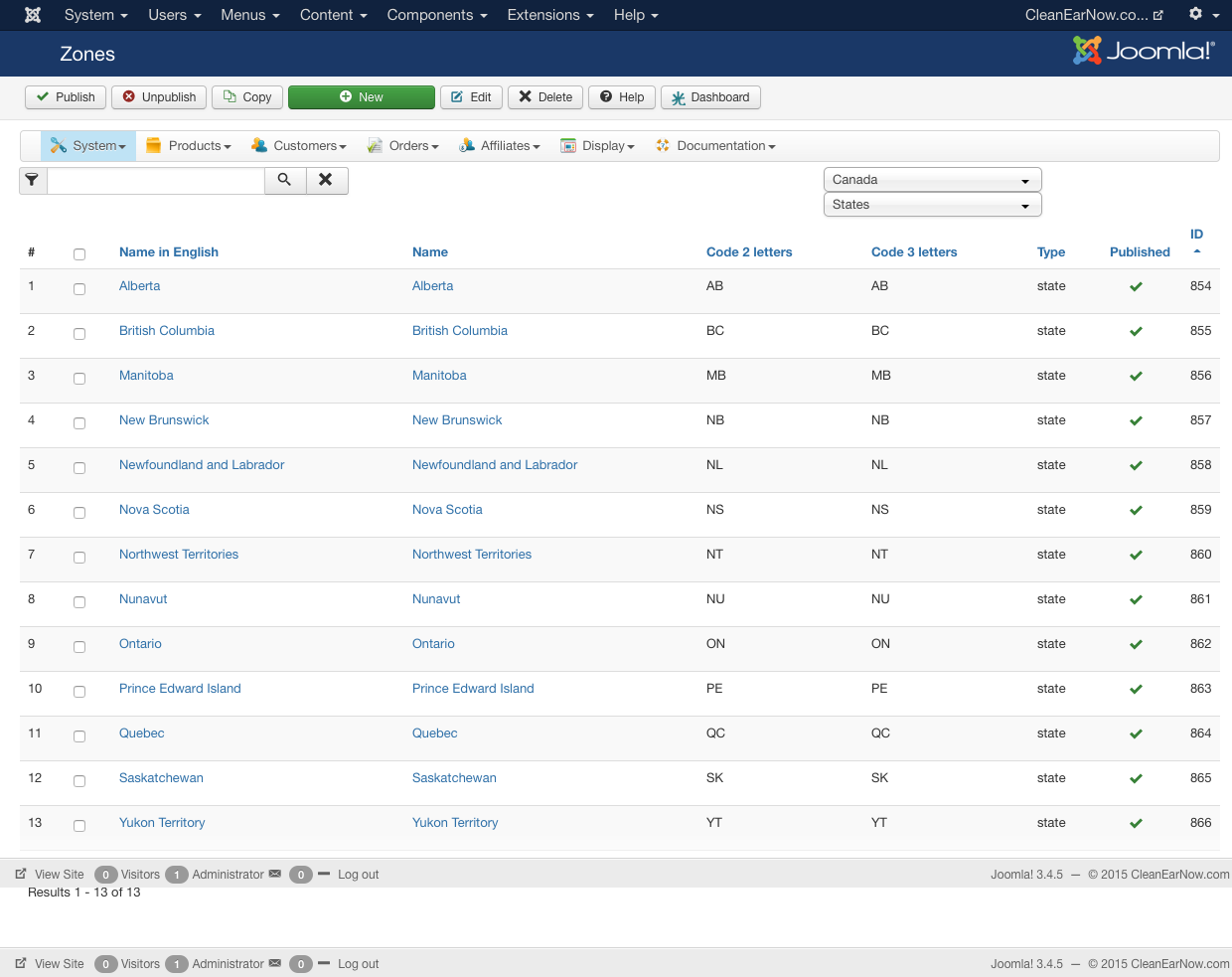 I would like to set up the zones or whatever I need to set up so that only the United States and Canada are in the drop downs in login during checkout. At this moment, I have unpublished all countries except the USA and CAN. But, only one of the states/provinces show during checkout. See the attachement.