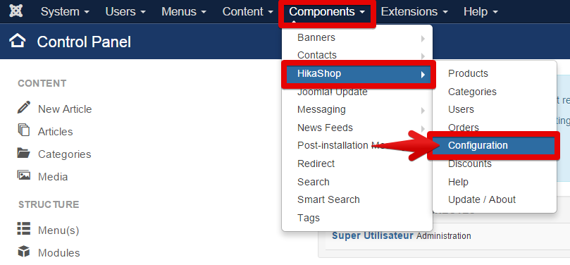 Components -> HikaShop -> Configuration