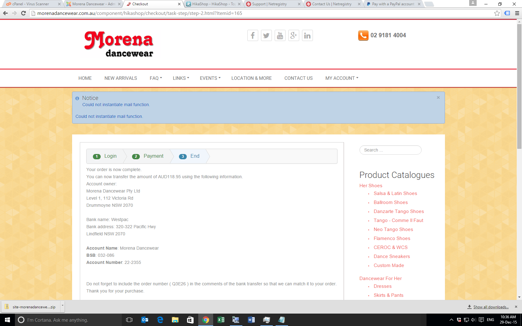 The issue "Could not instantiate mail function." is not related to HikaShop (or Joomla in general) but to your web hosting.
