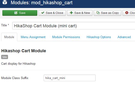 1. Under Modules, I created a new module of type Hikashop (mini cart), gave it suffix - hika_cart_mini. Positioned this module to display right hand side.