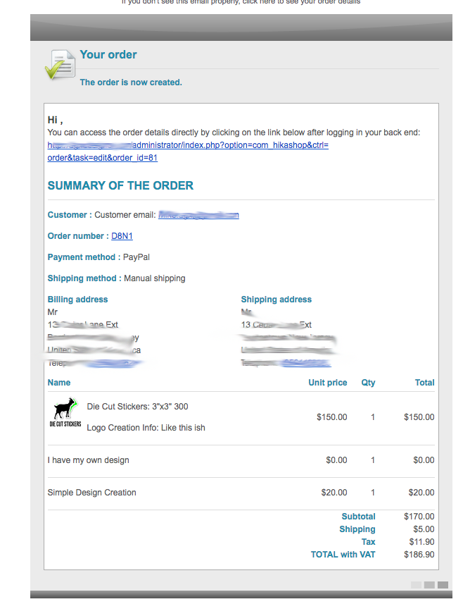 Attached images are the product item's fields and order confirmation email.