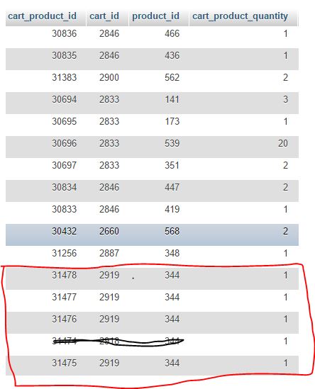 I've checked the database and in the hikashop_cart_product table I see the same product_id, all with quantity 1. See attachment.