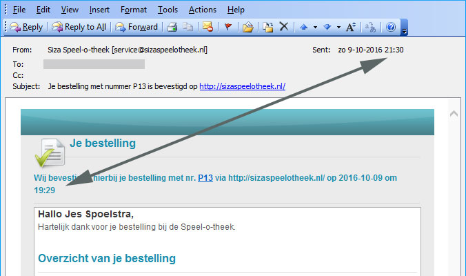 In the mail message order-creation-notification the time stamp of the mail header does not correspond with the time in the message. Difference is 2 hours. The mail header is correct.