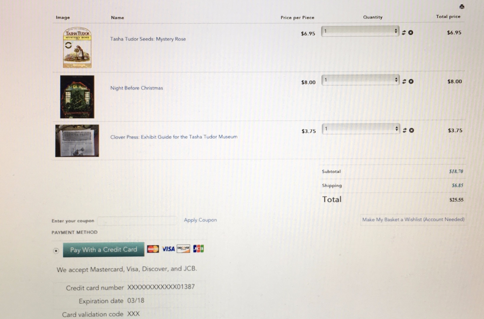 Hi Amy, I tried to order three items through the new Tasha Tudor & Family website last night (11/18/2016). I entered my credit card information, but it did not look like the order was accepted, but I was not sure. Are you able to see anything on your side?