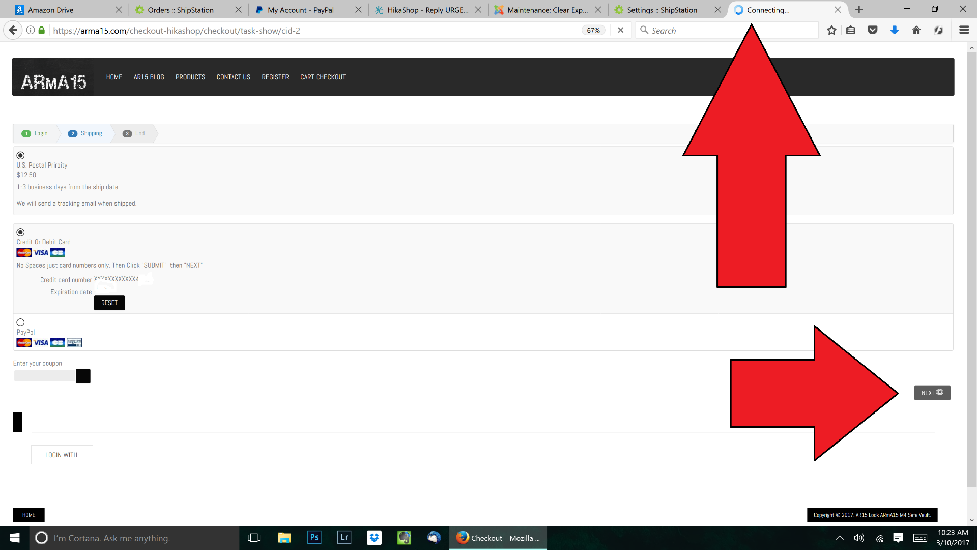 The "Next" Button which is the last button to be pressed to create order and change payment still just endlessly shows a loading wheel on the "next" button. Also the tab shows "connecting" with a loading wheel spinning.