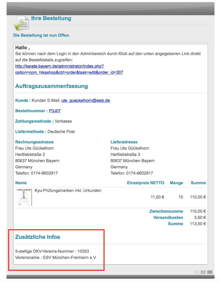 The order custom fields are provided by HikaShop Business.