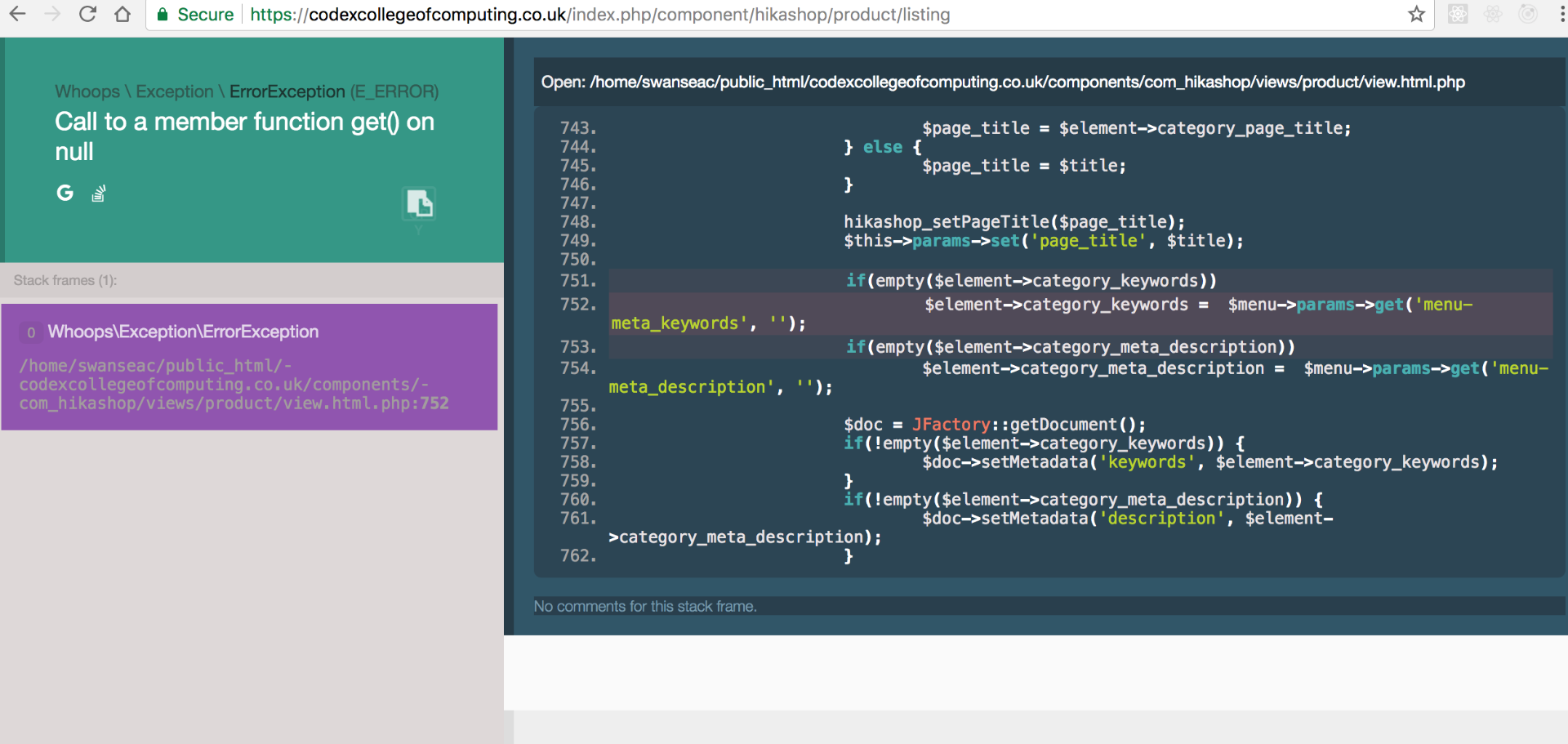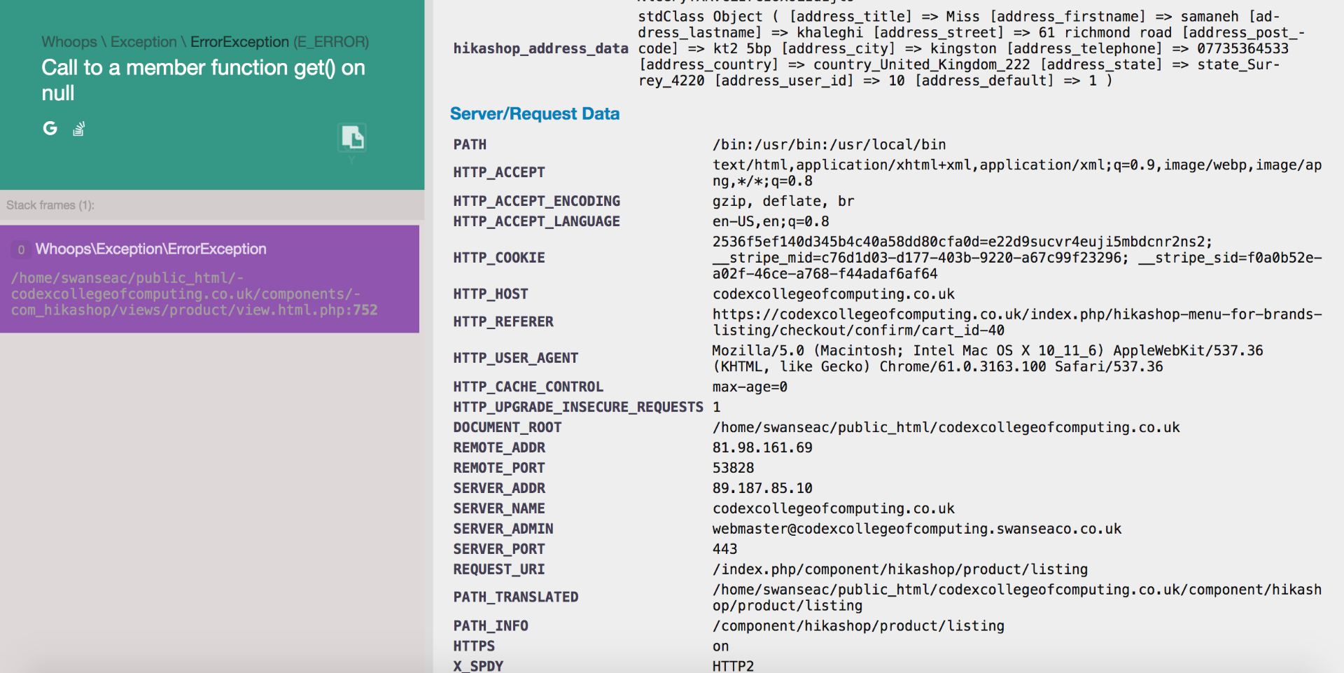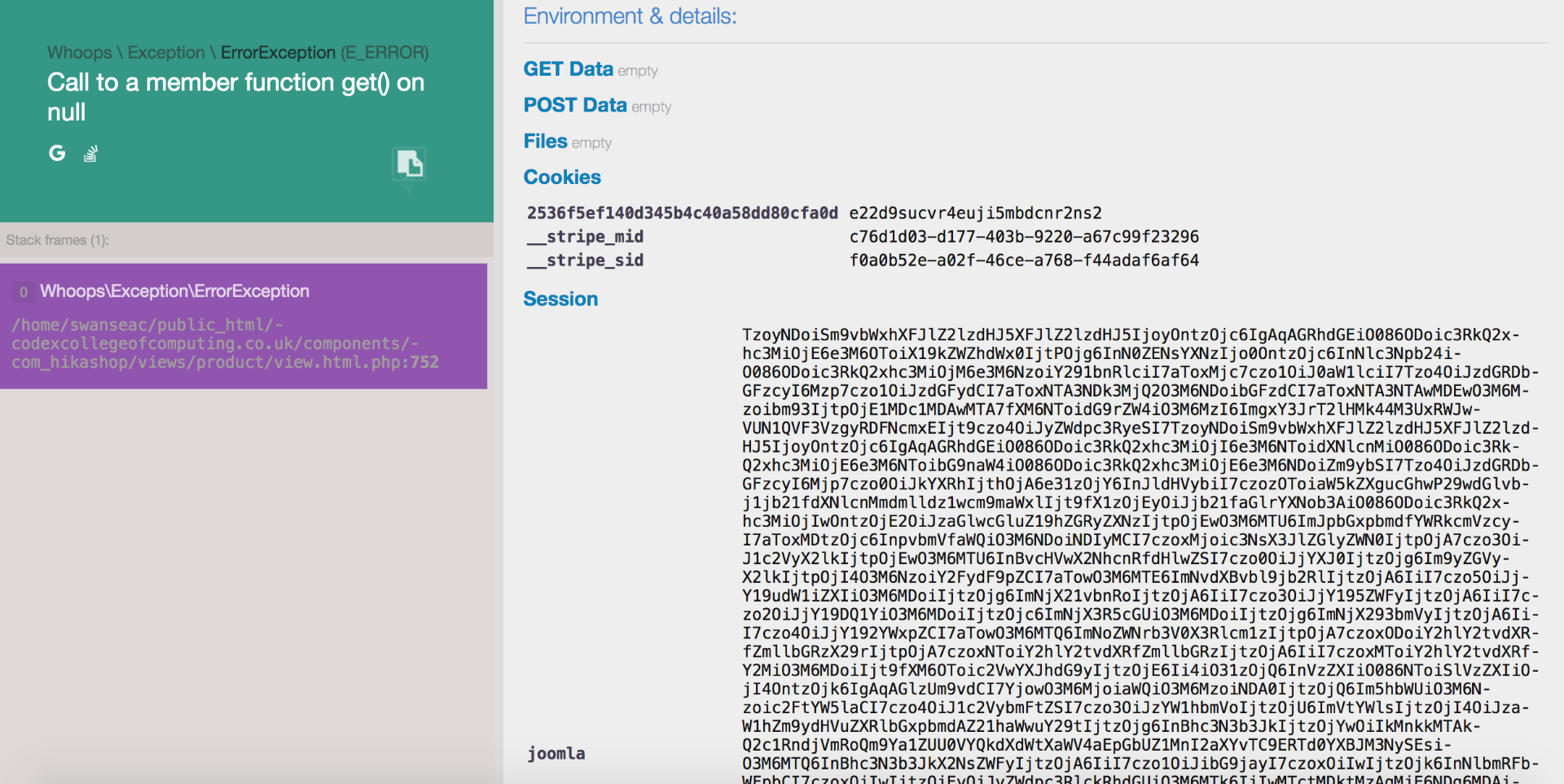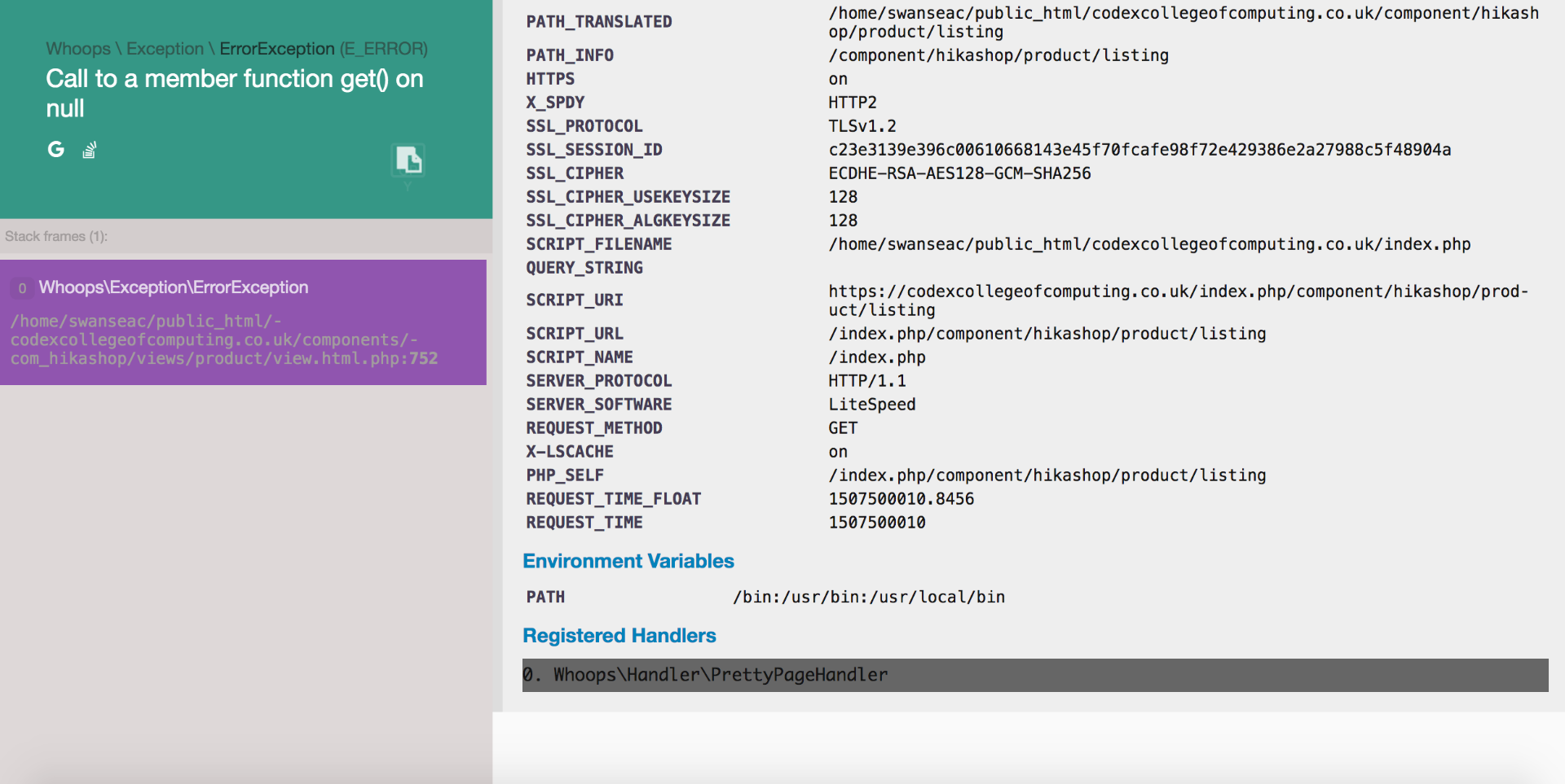 Also, I get this error message when the payment fails, but the debug mode is off:
