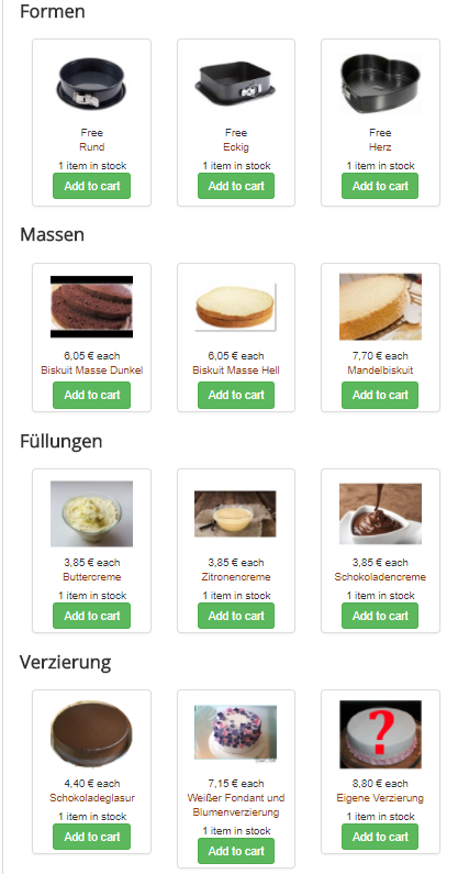 We have to do a project in university, where we have to create an only shop. Our topic is cake and we have to not only sell pre made cakes, but also customizable ones. Therefore we created a "configurator", we made a new category with the subcategories (mass, filling and fondant).