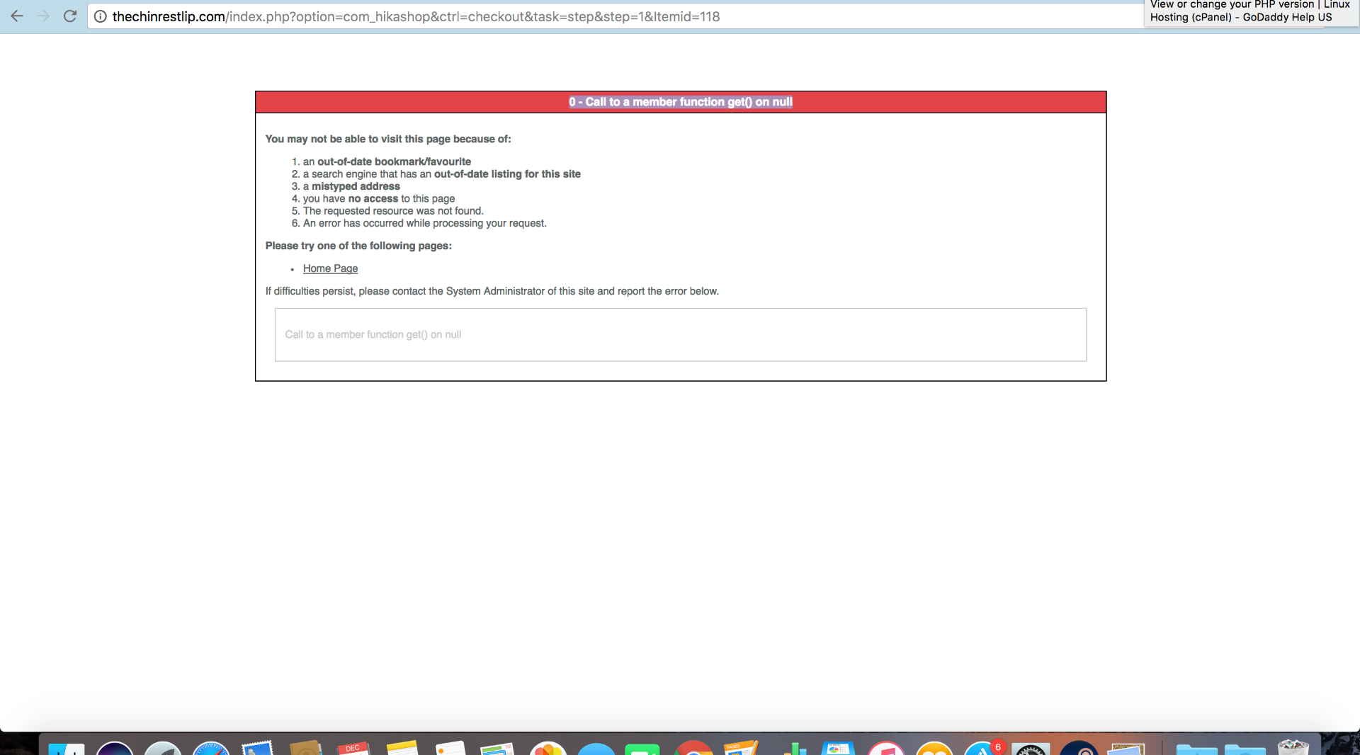 and this message showed up on the check out (on the 0 - Call to a member function get() on null page):