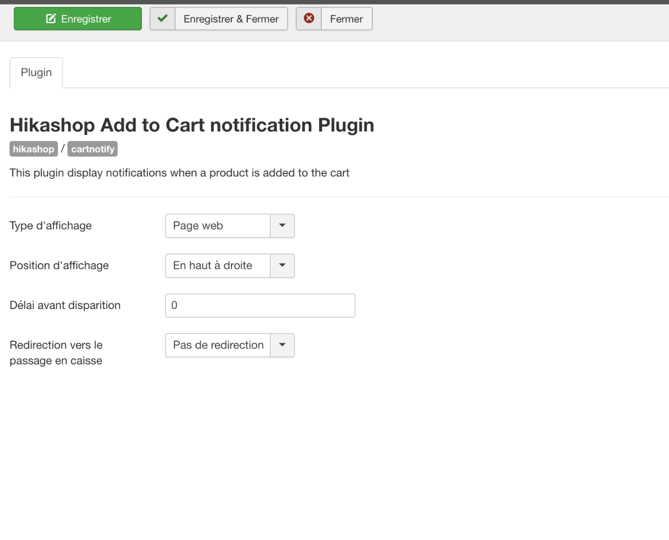Before you have to re-active your Hikashop Add to Cart notification Plugin and reproduce this configuration :