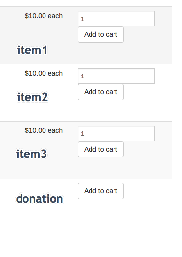 1) Is there a better way to list the "donation" field with the rest of the products (in the list as I have)? The "add to cart" button is out of alignment. Ideally, I would like to have that "donation" listed and look the same as rest of the products in that list.